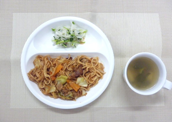 令和6年2月1日(木)の献立 2024/02/01 今日の給食は、「焼きそば」、「大根と豆苗のじゃこサラダ」と「小松菜のすまし汁」 おやつは、「牛乳」、「りんご」と「ぽたぽた焼」です。 ★「大根と豆苗のじゃこサラダ」は新メニューです🍴
