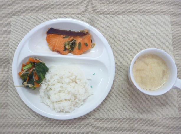 今日の給食は、「鮭のねぎみそ焼き」、「小松菜とあげの煮びたし」と「豆乳汁」 おやつは、「牛乳」、「りんご」と「ぽたぽた焼」です。