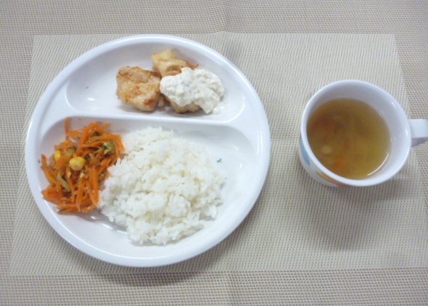 今日の給食は、「チキン南蛮」、「キャロットサラダ」と「きのこのスープ」 おやつは、「牛乳」、「いちご」と「雪の宿」です。