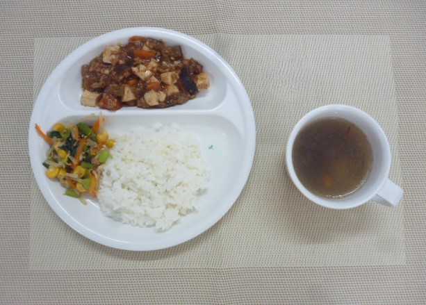 令和6年6月27日(木)の献立 2024/06/27 今日の給食は、「麻婆茄子」、「小松菜のナムル」と「もずくスープ」 おやつは、「牛乳」、「とうもろこし」と「ハッピーターン」です。 ★おやつの「とうもろこし」は、ほし組さんとつき組さんが とうもろこしの皮をむいてくれました🌽