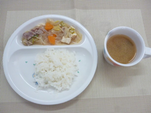 今日の給食は、「豚肉のすき焼き風煮物」と「じゃがいものみそ汁」