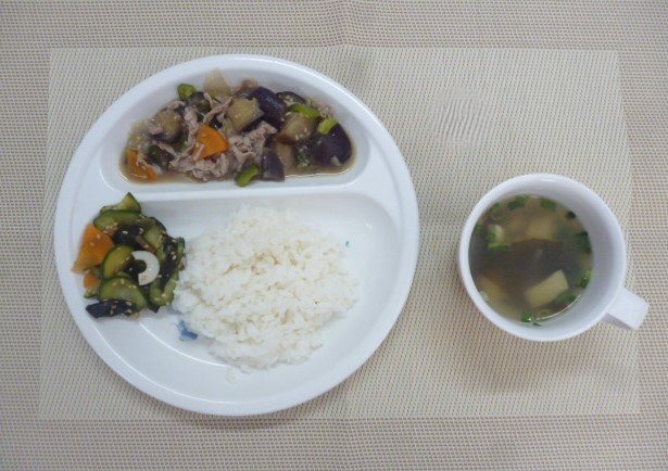 今日の給食は、「なすのなべしぎ」、「きゅうりの酢の物」と「玉ねぎのすまし汁」 おやつは、「牛乳」、「ブラウニー」と「動物ビスケット」です。