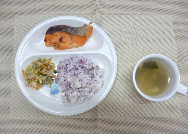 令和6年7月30日(火)の献立 2024/07/30 今日の給食は、「ゆかりごはん」、「鮭のごまみそ焼き」、「鶏ささみと野菜のおかか和え」と 「豆腐のすまし汁」 おやつは、「牛乳」、「とうもろこし」と「えびせんべい」です。 ★おやつの「とうもろこし」は、はな組1歳さんとひかり組さんがむいてくれました🌽 ★ほし組さんは、「ゆかりごはん」を自分たちでおにぎりにして食べました!