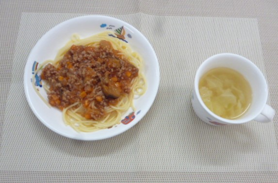 今日の給食は、「なすのミートスパゲティー」と「野菜スープ」 おやつは、「牛乳」と「お楽しみおやつ」です。