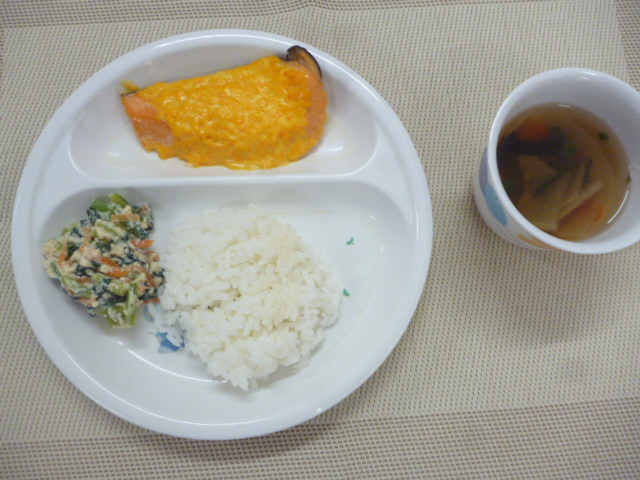 令和6年9月13日(金)の献立 2024/09/13 今日の給食は「白身魚のもみじ焼き」「小松菜の白和え」「大根のすまし汁」です。 おやつは「りんご」「マリービスケット」です。 ★「さばの煮つけ」は、「白身魚のもみじ焼き」に変更となりました。 今日の白身魚は、鮭です🐟