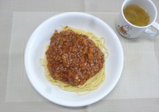 今日の給食は、「なすのミートスパゲティー」と「野菜スープ」 おやつは、「牛乳」と「お楽しみおやつ」です。