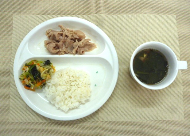 今日の給食は、「豚肉の西京焼き」、「キャベツの和風和え」と「豆腐のすまし汁」 おやつは、「牛乳」と「きなこ揚げぱん」です。