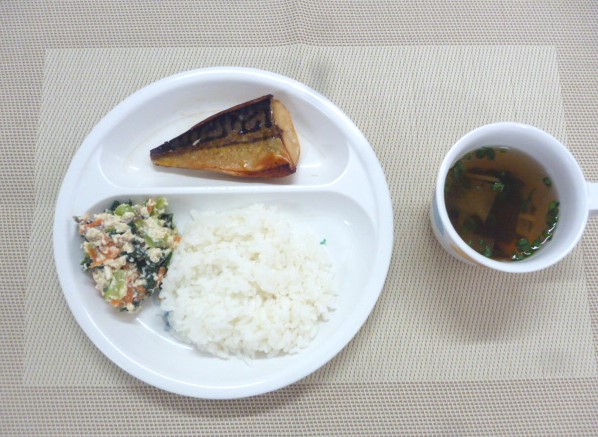 令和6年9月27日(金)の献立 2024/09/27 今日の給食は、「さばのしょうゆ漬け焼き」、「小松菜の白和え」と「大根のすまし汁」 おやつは、「牛乳」、「りんご」と「マリービスケット」です。 ★「さばの煮つけ」は、「さばのしょうゆ漬け焼き」に変更となりました。
