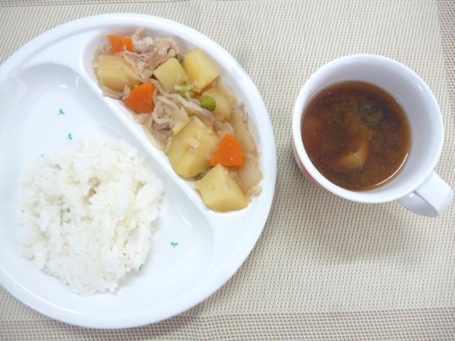 今日の給食は、「肉じゃが」と「小松菜のみそ汁」 おやつは、「牛乳」と「お楽しみおやつ」です。