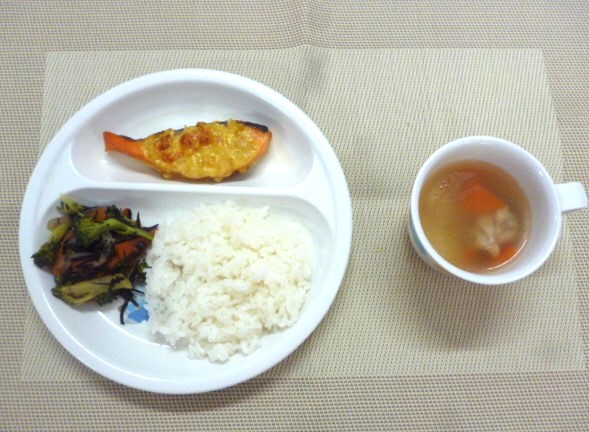 令和6年10月8日(火)の献立 2024/10/08 今日の給食は、「白身魚のカレーマヨ焼き」、「ブロッコリーとひじきのソテー」と「チキンスープ」 おやつは、「牛乳」、「ココアマシュマロおこし」と「こんぶ」です。 ★今日の白身魚は、鮭です🐟