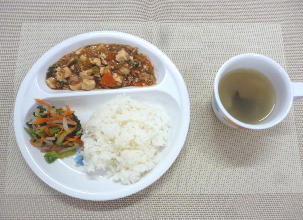 今日の給食は、「麻婆豆腐」、「チンゲン菜のナムル」と「わかめスープ」 おやつは、「牛乳」、「フルーツヨーグルト」と「新潟仕込み」です。