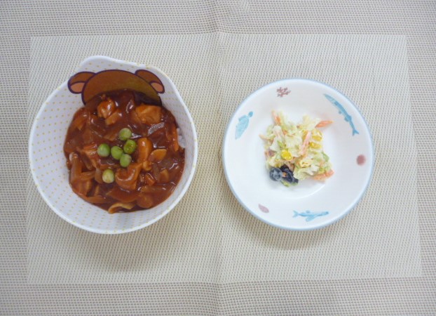 今日の給食は、「ハヤシライス」と「ひよこ豆のサラダ」