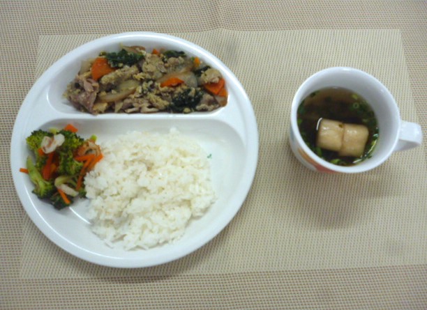 令和6年10月30日(水)の献立 2024/10/30 今日の給食は、「豚肉の柳川風煮物」、「ブロッコリーのおかか和え」と「麩のすまし汁」 おやつは、「牛乳」、「黒糖蒸しパン」と「動物ビスケット」です。