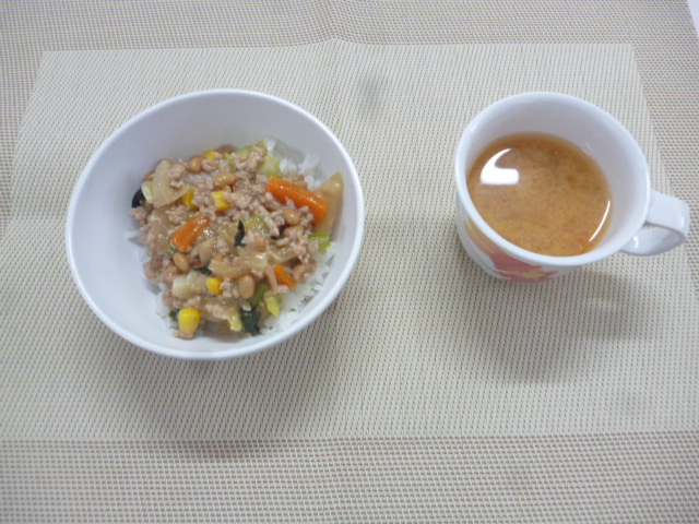今日の給食は、「納豆そぼろ丼」と「じゃがいものみそ汁」 おやつは、「牛乳」と「お楽しみおやつ」です。