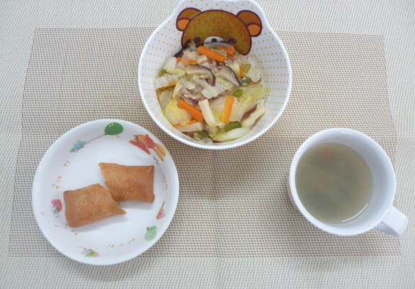 今日の給食は、「中華丼」、「春巻き」と「春雨スープ」 おやつは、「牛乳」、「みかん」と「ハッピーターン」です。