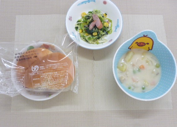 令和6年11月13日(水)の献立 2024/11/13 今日の給食は、「イエローロールパン」、「クリームシチュー」と「ほうれん草のソテー」 おやつは、「牛乳」、「わかめおにぎり」と「ぽりぽり小魚」です。 ★今日はパン給食です🥖 今日の「クリームシチュー」には、さつまいもが入っています🍠 ★つき組さんは、おやつの「わかめおにぎり」を自分たちで握って食べました🍙