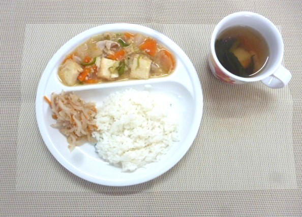 令和6年11月14日(木)の献立 2024/11/14 今日の給食は、「厚揚げと豚肉のみそ炒め」、「もやしと切干大根のお浸し」と 「ほうれん草のすまし汁」 おやつは、「牛乳」、「オレンジ蒸しパン」と「動物ビスケット」です。