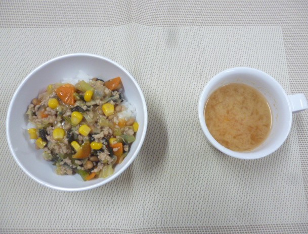 今日の給食は、「納豆そぼろ丼」と「じゃがいものみそ汁」 おやつは、「牛乳」と「お楽しみおやつ」です。