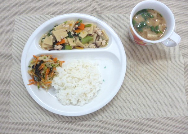 令和6年11月21日(木)の献立 2024/11/21 今日の給食は、「高野豆腐とひき肉の煮物」、「キャベツの和風和え」と「大根のみそ汁」 おやつは、「牛乳」、「ヨーグルトのきなこがけ」と「しょうゆせんべい」です。