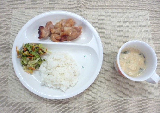 令和6年11月22日(金)の献立 2024/11/22 今日の給食は、「ふりかけごはん」、「鶏肉の照り焼き」、「花野菜ののり酢和え」と「豆乳汁」 おやつは、「牛乳」、「りんご」と「ぱりんこ」です。 ★今日は「ごはん」にふりかけをかけました。 ★写真は白ごはんになっています。