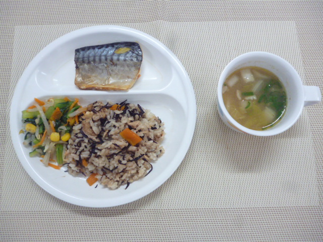 今日の給食は、「ひじきごはん」、「さばの塩焼き」、「小松菜のごま和え」と「白菜のみそ汁」 おやつは、「牛乳」、「豆乳あべかわ」と「こんぶ」です。