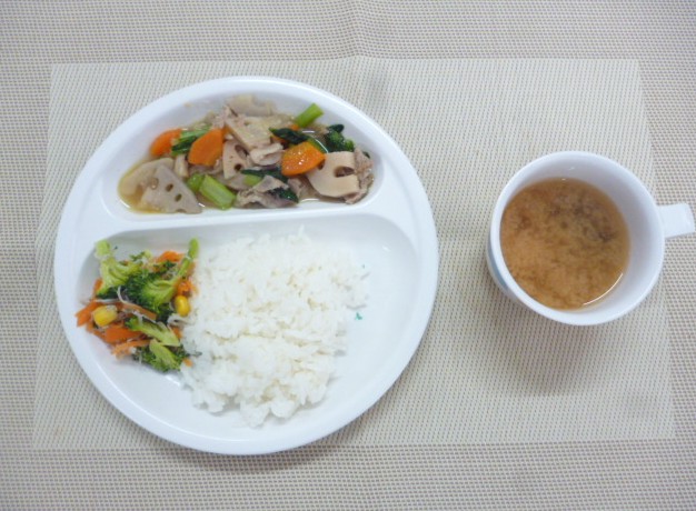 今日の給食は、「豚肉とれんこんの炒め物」、「ブロッコリーとしらすのナムル」と「玉ねぎのみそ汁」 おやつは、「牛乳」と「ジャムサンド」です。