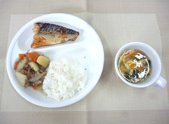 今日の給食は、「さばのごま照り焼き」、「じゃがいもきんぴら」と「かき玉汁」 おやつは、「牛乳」、「りんご」と「ウエハース」です。