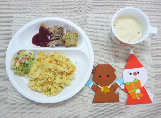 今日の給食は、「カレーピラフ」、「ミートローフ」、「星型ポテト」、「クリスマスサラダ」と