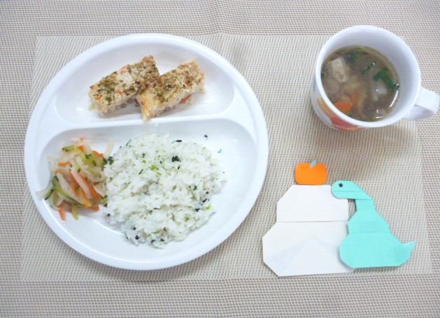今日の給食は、「七草風ごはん」、「松風焼き」、「三色なます」と「けんちん汁」