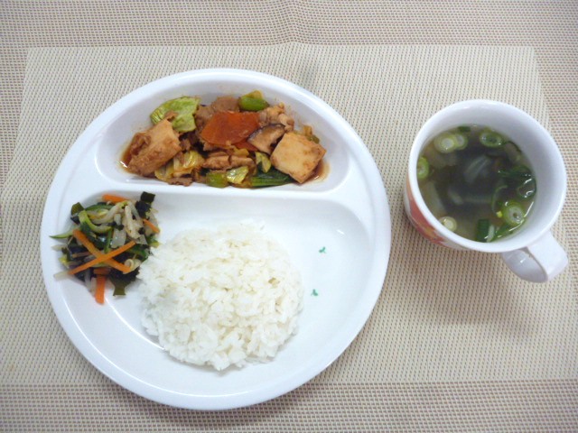 今日の給食は、「ジャージャン豆腐」、「きゅうりともやしのナムル」と「わかめスープ」 おやつは、「牛乳」と「肉まん風」です。