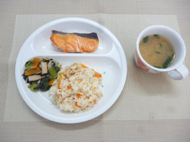 今日の給食は、「こぎつねごはん」、「鮭の塩焼き」、「小松菜とさつま揚げの煮浸し」と 「里芋のみそ汁」 おやつは、「牛乳」と「カレー蒸しパン」です。