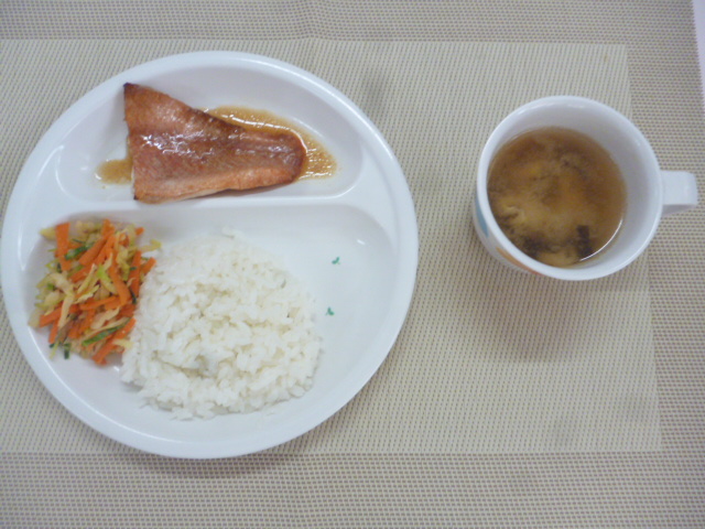 今日の給食は「ごはん」と「煮魚」と「キャベツのごま和え」と「味噌汁」
