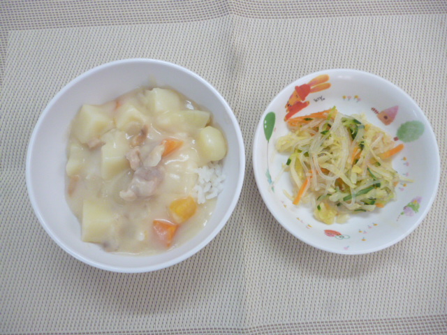 今日の給食は「ごはん」と「クリームシチュー」と「中華風和え物」