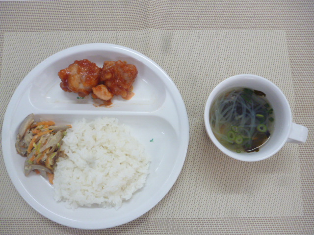 令和7年4月18日(金)の献立 2025/04/18 今日の給食は「鶏肉のケチャップ和え」「かみかみサラダ」「春雨のすまし汁」 と「ごはん」です。 おやつは「カップケーキ」「揚げせんべい」と「牛乳」です。