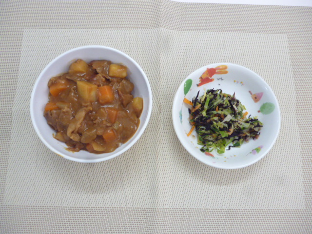 今日の給食は「カレー」と「ひじきとキャベツのサラダ」