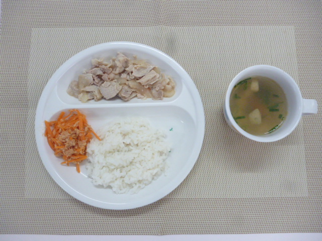 今日の給食は「豚肉の桑焼き」「にんじんしりしり」「揚げと野菜のすまし汁」