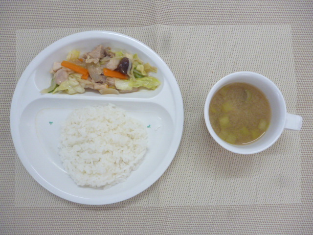 令和7年6月18日(水)の献立 2025/06/18 今日の給食は「ごはん」「鶏肉の野菜炒め」「豆腐の味噌汁」 おやつは「牛乳」「イチゴジャムのケーキ」「ラムネ」です。 ※発注の関係でメニューが変更になっています。
