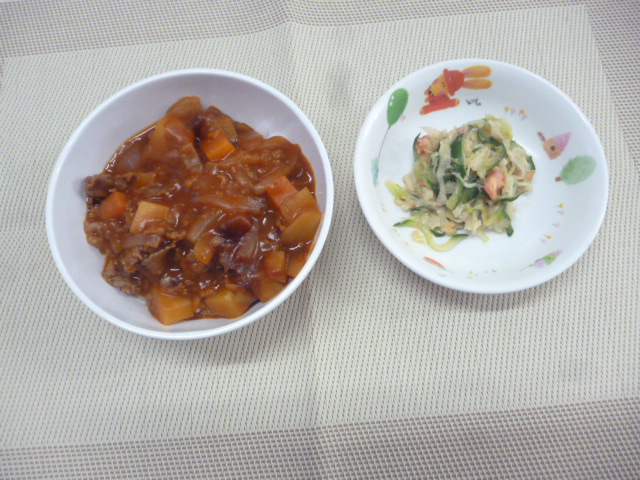 今日の給食は「ハヤシライス」と「夏野菜のごまあえ」