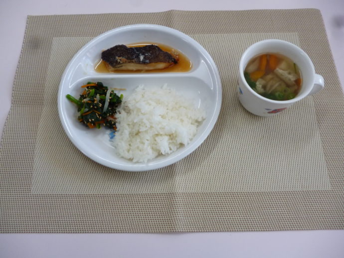 今日の給食は、「煮魚」、「ほうれん草のゴマ和え」と「けんちん汁」 おやつは、「牛乳」、「人参ケーキ」と「ソフトせんべい」です。