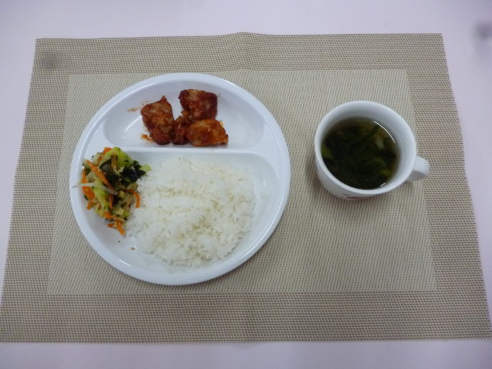 今日の給食は、「鶏肉のケチャップ和え」、「和風サラダ」と「きのこスープ」 おやつは、「牛乳」、「ふかし芋」と「ぱりんこ」です。