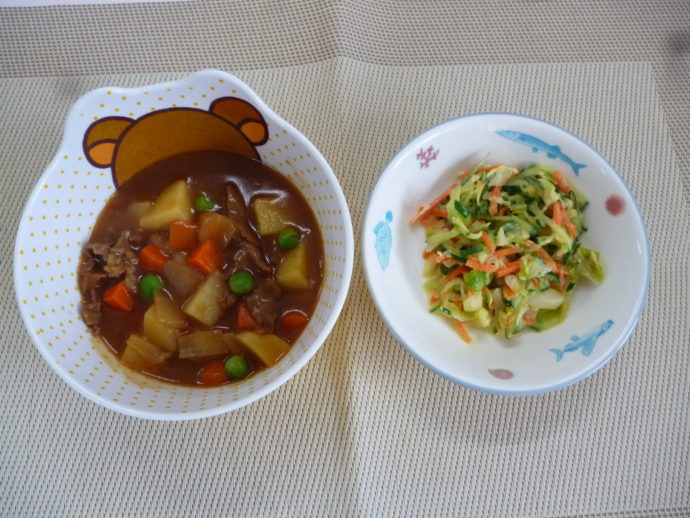 今日の給食は、「カレーライス」と「ドレッシングサラダ」 おやつは、「牛乳」、「リンゴ」と「ぱりんこ」です。