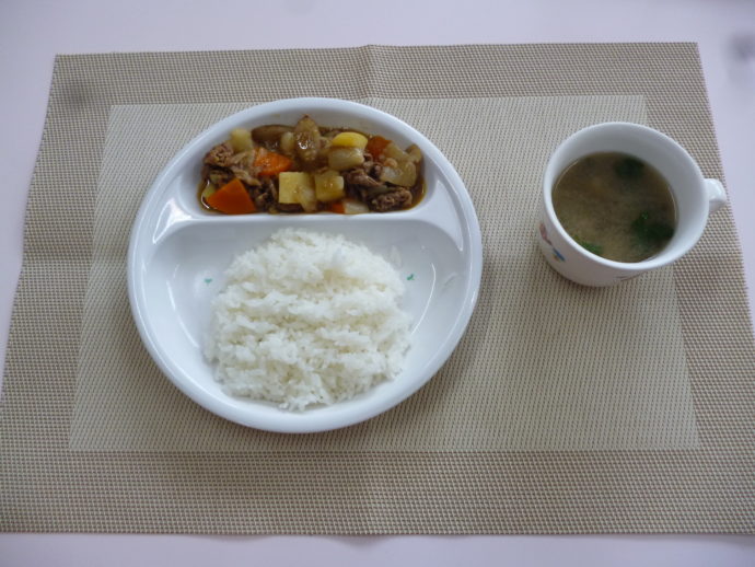 今日の給食は、「肉じゃがカレー味」と「茄子の味噌汁」 おやつは、「牛乳」、「黒糖入りわらび餅」と「揚げせんべい」です。