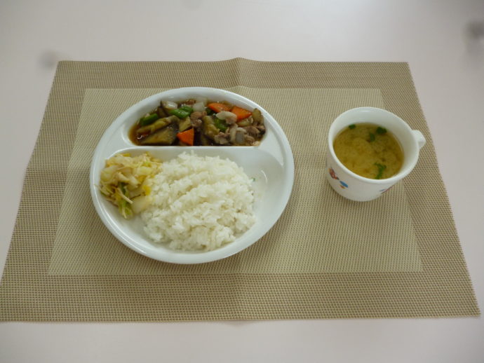 今日の給食は、「豚肉と茄子の炒め煮」、「白菜のレモン醤油和え」と「かぼちゃの味噌汁」