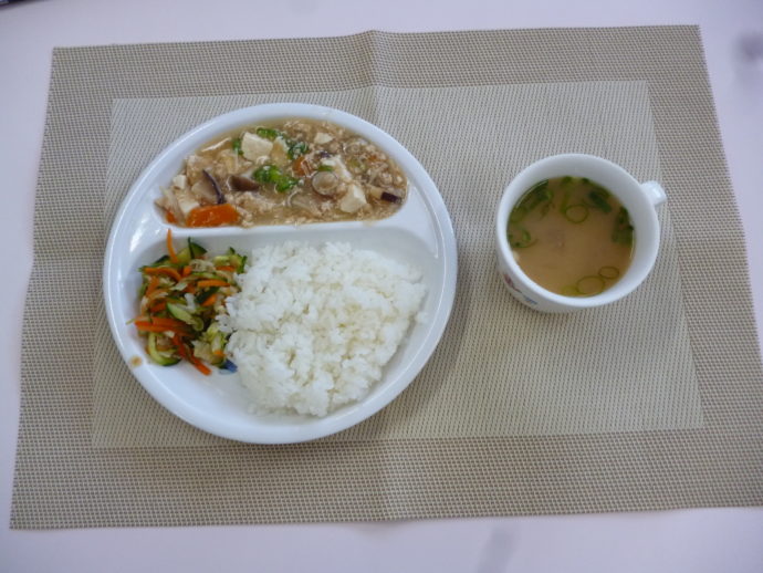 今日の給食は、「豆腐のきのこあんかけ」、「キャベツのおかか和え」と「冬瓜のみそ汁」 おやつは、「牛乳」、「ぶどうゼリー」と「ぽたぽた焼き」です。