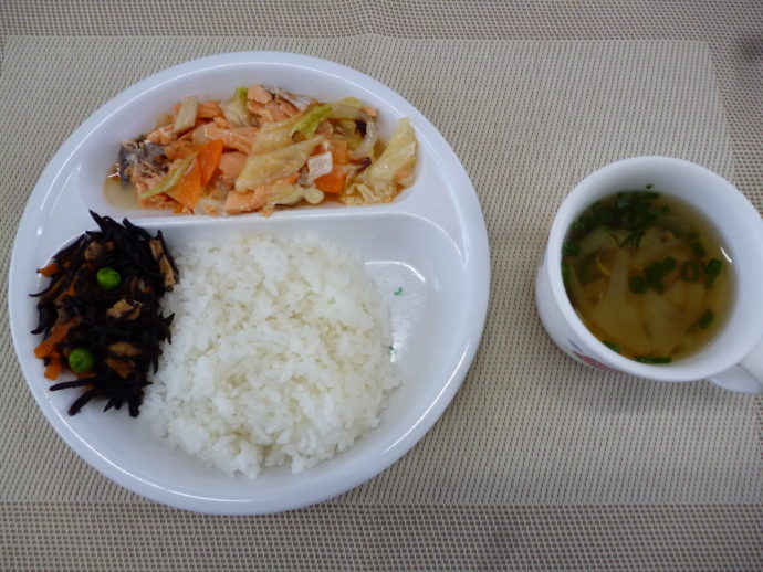 今日の給食は、「鮭のちゃんちゃん焼き」、「ひじきの煮物」と「湯葉のすまし汁」 おやつは、「牛乳」、「みたらし団子」と「ぽりぽり小魚」です。