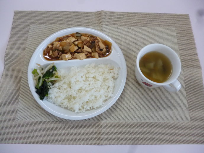 今日の給食は、「麻婆豆腐」、「小松菜のナムル」と「中華スープ」 おやつは、「牛乳」、「ヨーグルト」と「ポン菓子」です。