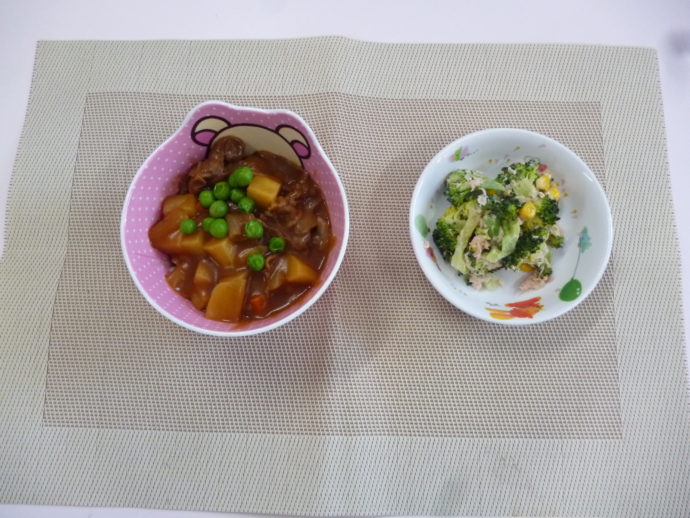 今日の給食は、「カレーライス」と「ブロッコリーとツナのサラダ」