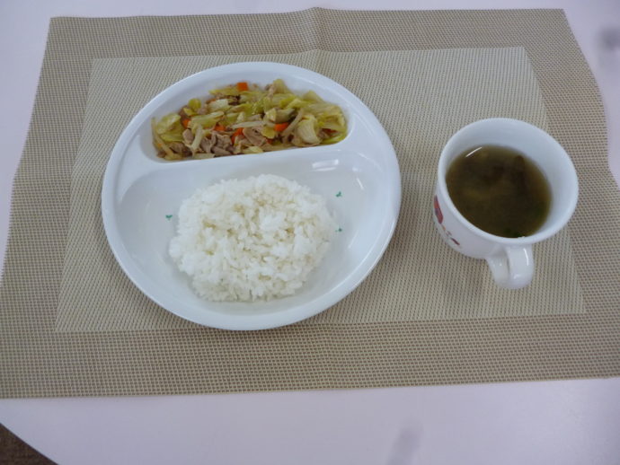 今日の給食は、「豚肉のカレー野菜炒め」と「きのこのみそ汁」 おやつは、「牛乳」と「お楽しみおやつ」です。