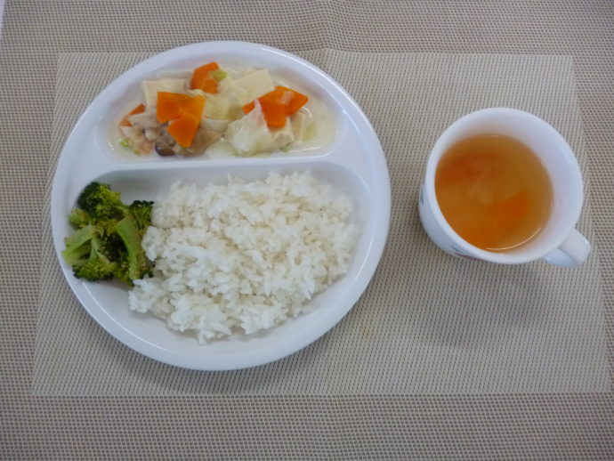 今日の給食は、「高野豆腐のクリーム煮」、「ブロッコリーのごま和え」と「オニオンスープ」 おやつは、「牛乳」、「オレンジ」と「おにぎりせんべい」です。