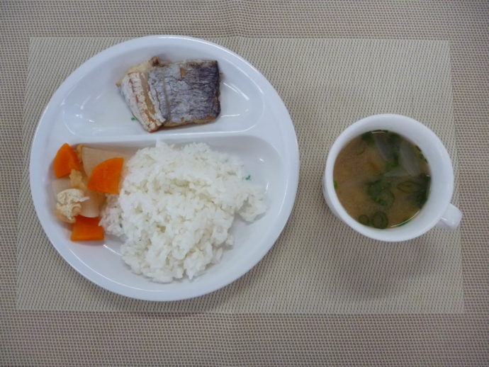 今日の給食は、「太刀魚の塩焼き」、「大根とあげの煮物」と「なすのみそ汁」 おやつは、「牛乳」、「モモ缶」と「アスパラガスビスケット」です。